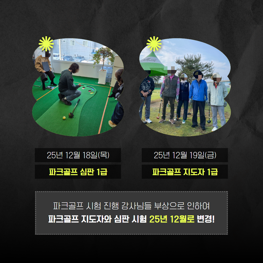 파크골프 시험 일자가 11월 24, 25일 에서 12월 18, 19일로 변경 되었습니다.